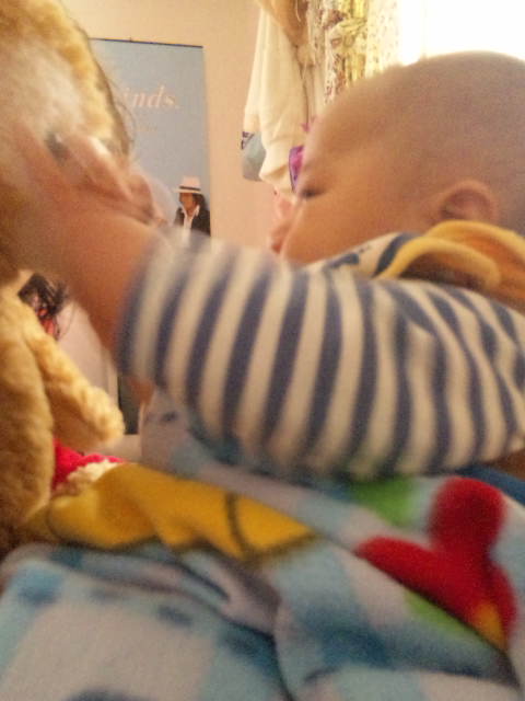 さっきまでダッフィーと戯れていました。たまに「あー」とか「うー」とか言って話しかけます。ダッフィーとツーショかとおもいきや、さりげなく龍ちゃんも出演。(笑)