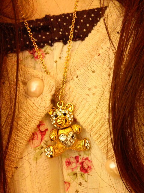 最近のお気に入りのくま子です。くまモチーフのネックレスがずっと欲しくて、この間巡り会いました。くま子300円。(笑)300円なら買うしかないでしょ!(笑)