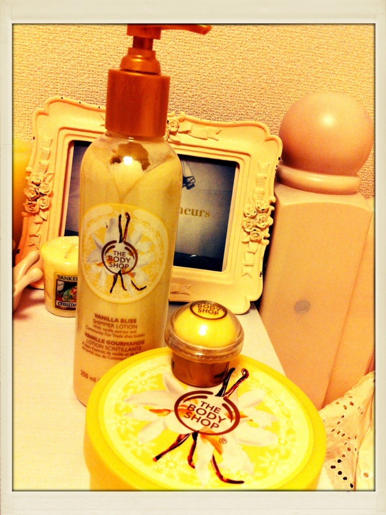 ちょっと早いけど…とお母さんがくれた!バニラ尽くし!さすが分かっていらっしゃる!(泣)ポンプ式のローションは付けたらキラキラして綺麗な上にバニラの香り。お母さんに女子力負けてるからがんばるよ…。