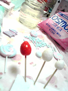 有意義に過ごすとか言いながら、ほぼ1日をこれに費やしてしまった私。(笑)しかしハーティクレイを最初に買ってしまった自分を恨みました。アイスとかマカロンにはいいと思うけどキャンディには不向きすぎた。地元の手芸屋さんとか画材屋さんに電話しまくってコスモスを発見しました。よかったー。にしても、私クオリティ低すぎる…落ち込むわぁ。辛うじて苺だけは苺っぽい。写メじゃただの赤い玉だけど。(笑)がんばろう!