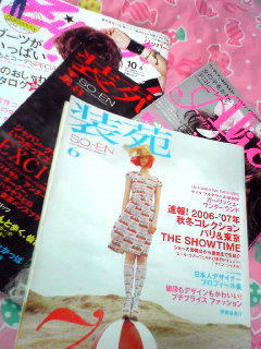 なんやかんや雑誌がたまっております。じっぱーとかもはや先月号…(笑)そろそろ消費しようかと思います。装苑は学校の図書室からレンタル。とりあえず気に入ったページがあった2冊を貸していただいた。2006年と2007年のものでした。意外と、最近のよりも前の号の方が割と好きな感じのページがあったりします。私…昔好きか。(笑)2年前ってよく考えると結構前だよなあ…。