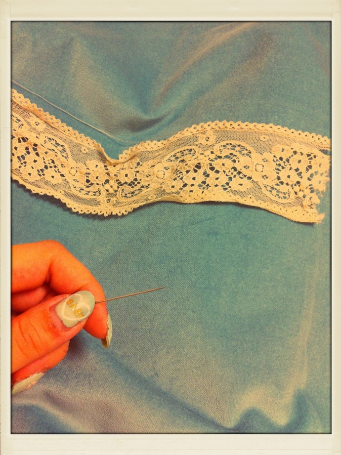 ミシンがまだ実家なので手縫い!久しぶりだーこの感じ。なんとかあったレースで。実家のレースとか布とか早く持ってきたいなぁ。