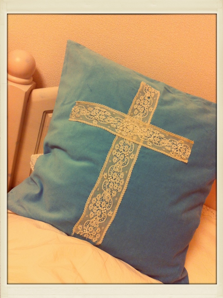 色味と素材に一目惚れしたクッションカバーにレース縫い付けて完成!真ん中じゃないし、いろいろぐにゃぐにゃだけど…(笑)早くミシン手元に欲しいーー!