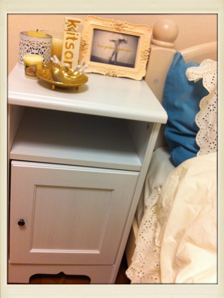 ベッドサイドテーブルの色みと脚に一目惚れ!お気に入り♪チェストの上がバリバリのパステルメルヘンだからお給料入ったらどうにかしたい!