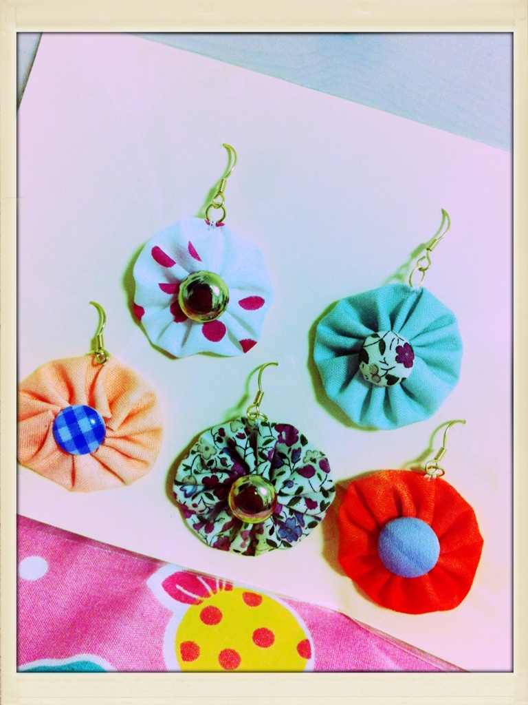 友達に頼まれて作ったヨーヨーキルトのピアス!ヨーヨーキルト地獄を思い出したけど、数個だと楽しかった!(笑)家にあるものだけで作っちゃったからイメージ通りか不安だけど喜んでくれるといいなぁ。