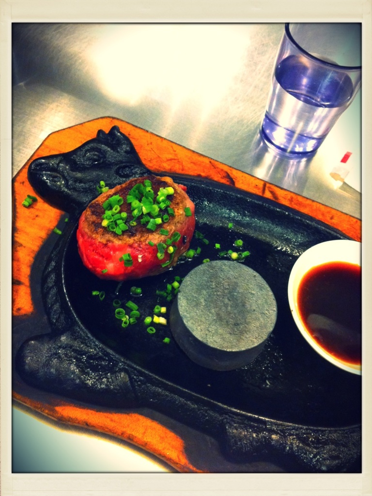 ハンバーグ!石の上でジュージュー焼きました。初体験!美味しかった~楽しかった。牛の鉄板もナイスセンス♪