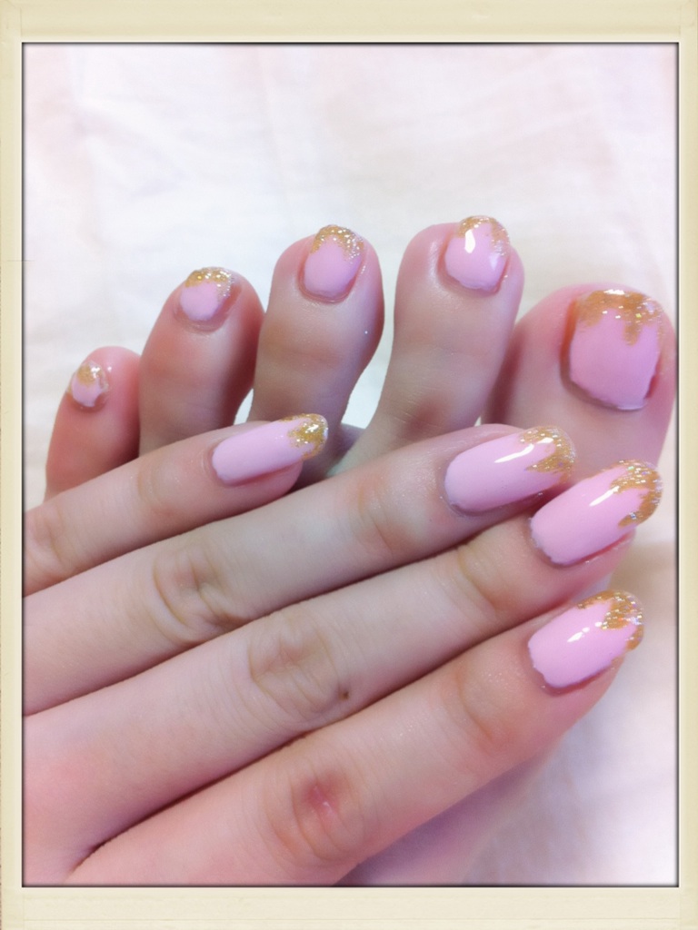ベビーピンクをベースにゴールドラメで、ちょっと垂れてる溶けてる風にしました。(笑)あんまり綺麗に垂れて溶けてないけど…。足もお揃い!塗り立てはやっぱ気分上がる~∧( 'Θ' )∧