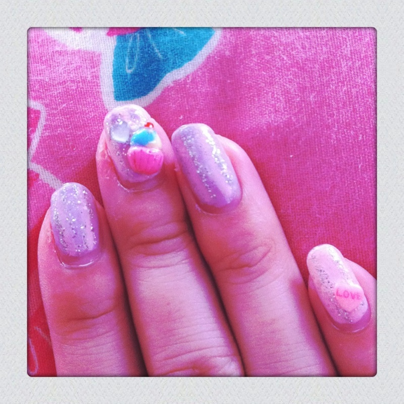 ベースの色は手も足も一緒で。手はパープル×ベビーピンクのストライプ。親指にはもちろんクマが居ます。(笑)今回のネイルはnoジェルで、自分でがんばりました…!結構前にやったからもう爪が伸び伸び。