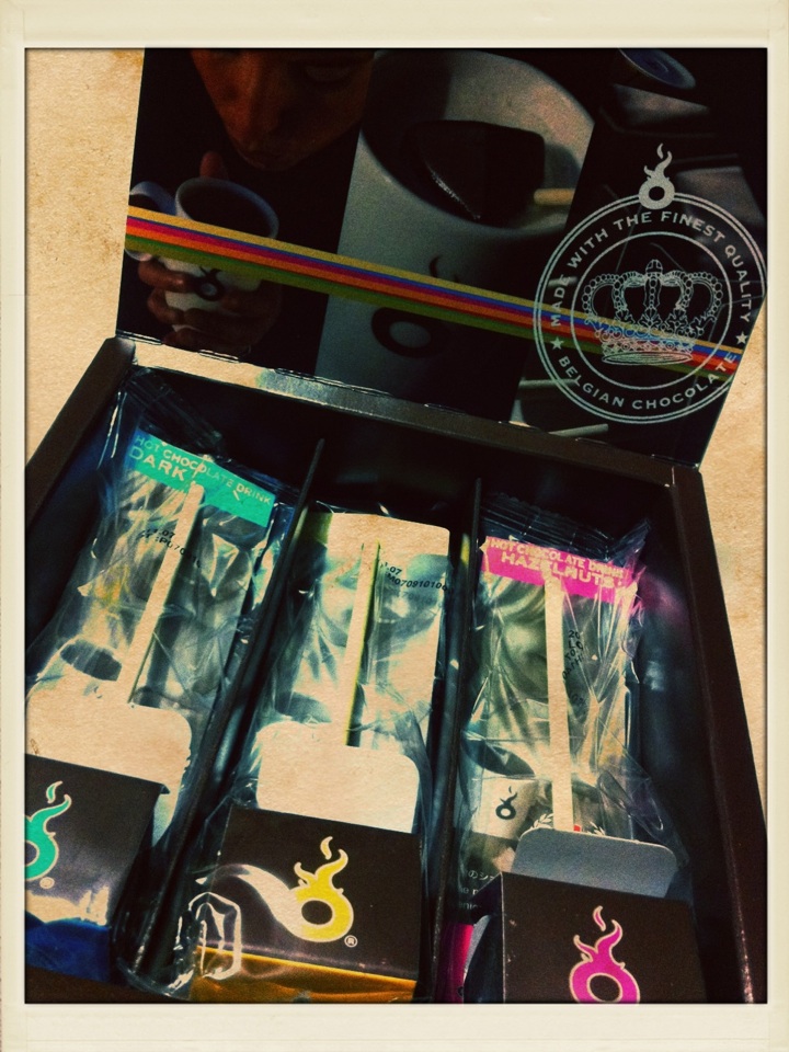 本日のホットチョコレート。疲れた時は甘いものに限るので今日はミルクチョコレートを。あとダークとヘーゼルナッツがあります~。ベルギー産のチョコだから美味しいー♪温かい甘いものでリラックス。